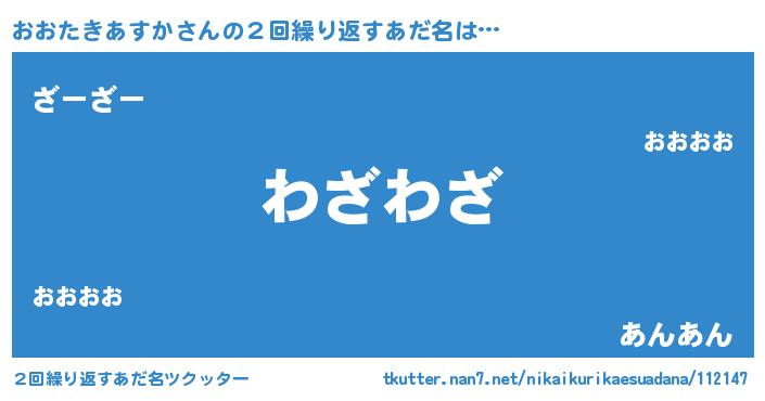 | 男性向けラノベタイトル風あだ名 | 『おおたきあすか~年齢イコール彼女いない歴の魔法使い~』 |