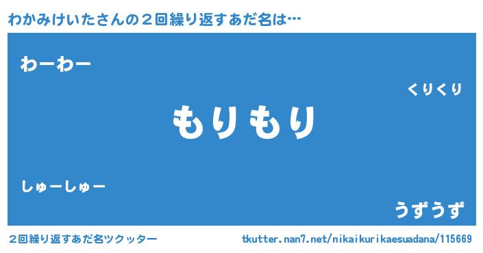 | 男性向けラノベタイトル風あだ名 | 『Re:わかみけいたから始める異世界生活』 |