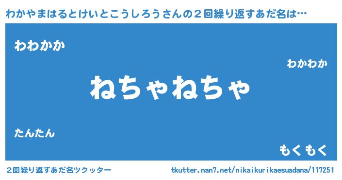 | 欧米人風あだ名 | 『ウサインわかやまはるとけいとこうしろう』 |