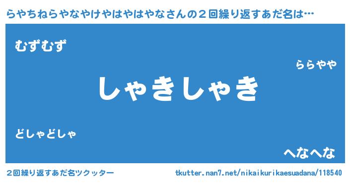 | 意味不明あだ名 | 『住所不定無職らやちねらやなやけやはやはやな(47歳)』 |