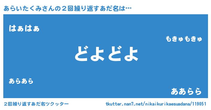 | 欧米人風あだ名 | 『あらいたくみ・ステッグマイヤー』 |
