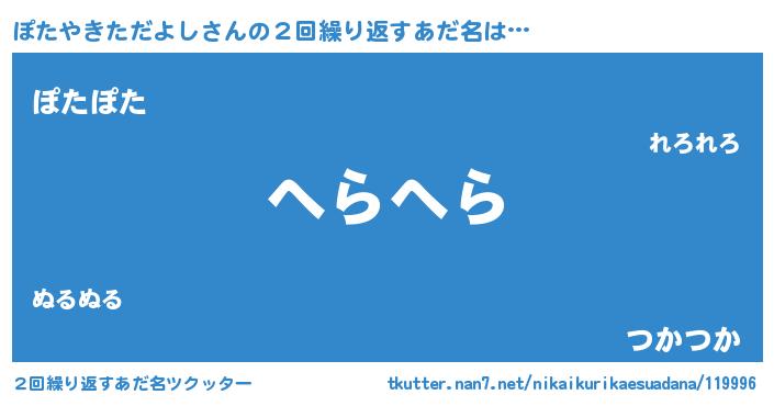| ヒーロー風カッコイイあだ名 | 『慈愛の使者ぽたやきただよし』 |