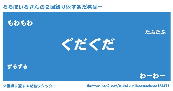 | 男性向けラノベタイトル風あだ名 | 『ろろほいろという概念が存在しない退屈な世界 』 |