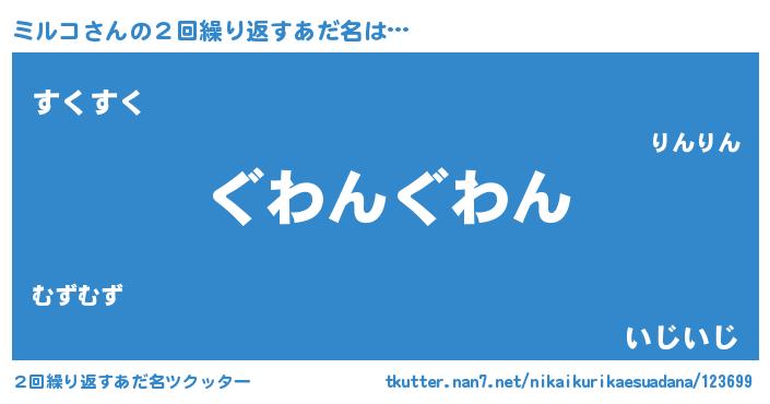 | 意味不明あだ名 | 『永久保存ミルコ』『めかぶ科ミルコ属』 |