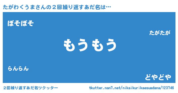 | 男性向けラノベタイトル風あだ名 | 『Re:たがわくうまから始める異世界生活』 |