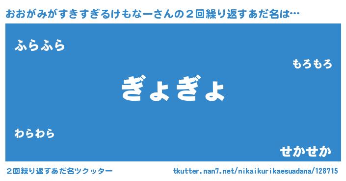 | 意味不明あだ名 | 『永久保存おおがみがすきすぎるけもなー』 |