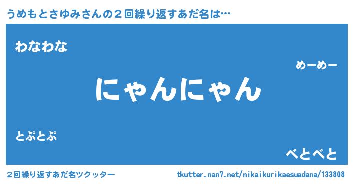 | 男性向けラノベタイトル風あだ名 | 『うめもとさゆみの嫁は女の子じゃないと思った?』 |