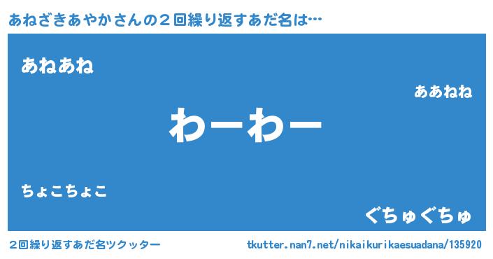 | ヘコむあだ名 | 『あねふぇ~』『あねざきあやか(遠い目)』 |