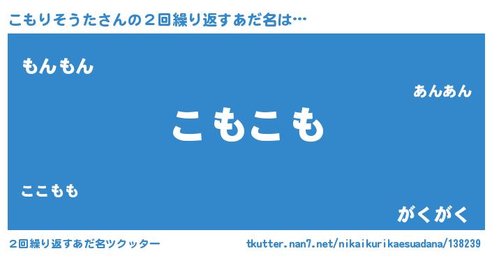 | 男性向けラノベタイトル風あだ名 | 『コモリソウタアートオンライン』 |