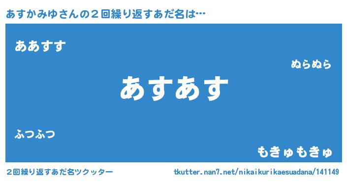 | 意味不明あだ名 | 『ペロリンあすかみゆ』『自称あすかみゆ』 |