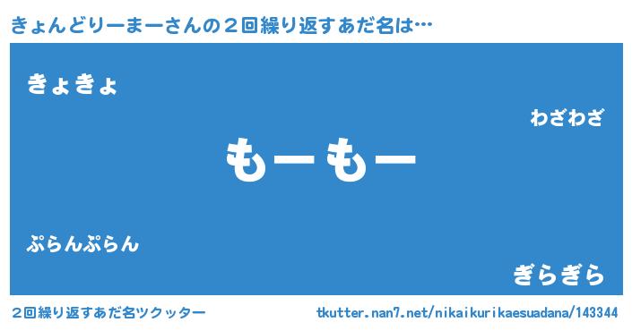 | 男性向けラノベタイトル風あだ名 | 『Re:きょんどりーまーから始める異世界生活』 |