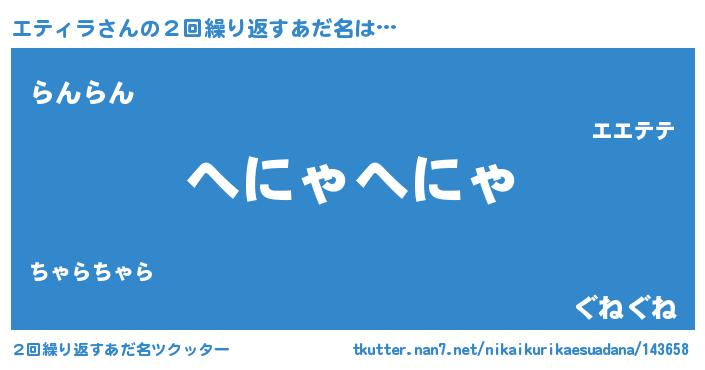 | 女子向けラノベタイトル風あだ名 | 『エティラ恋絵巻』『エティラの契約王妃』 |