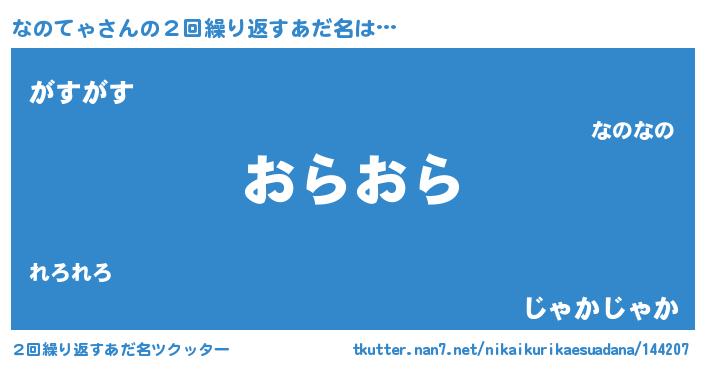 | 女子向けラノベタイトル風あだ名 | 『なのてゃの卵を拾いまして』 |
