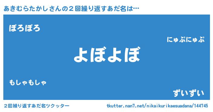 | ヘコむあだ名 | 『あきっぺ』『あきむらたかし(震え声)』 |
