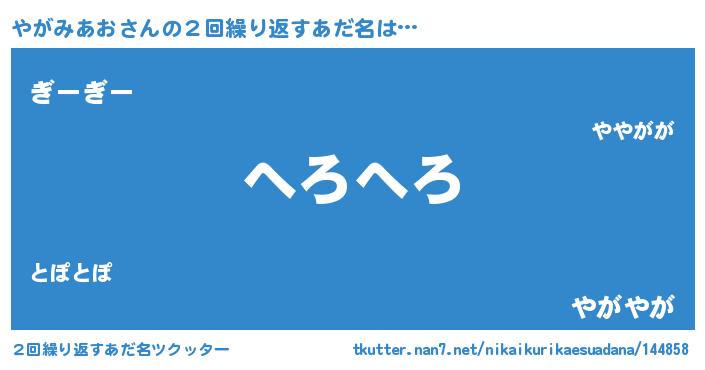 | ヒーロー風カッコイイあだ名 | 『慈愛の使者やがみあお』『天弓騎士ヤガ』 |