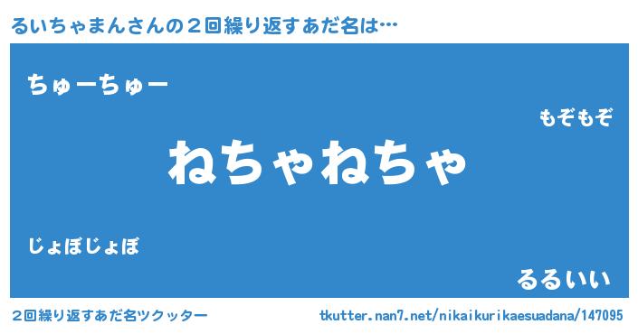 | 男性向けラノベタイトル風あだ名 | 『るいちゃまんの嫁は女の子じゃないと思った?』 |