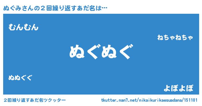| 男性向けラノベタイトル風あだ名 | 『ぬぐみの憂鬱』『はたらくぬぐみさま!』 |