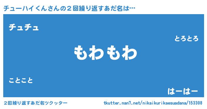 | ヘコむあだ名 | 『チュもー』『チューハイくん(小並感)』 |