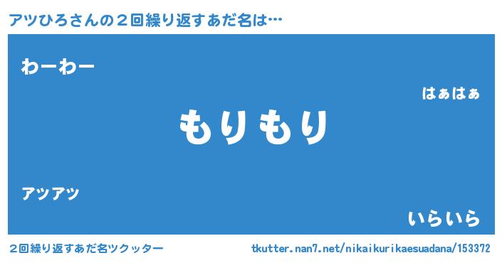 | 男性向けラノベタイトル風あだ名 | 『Re:アツひろから始める異世界生活』 |