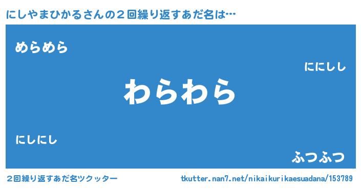 | 男性向けラノベタイトル風あだ名 | 『にしやまひかる~年齢イコール彼女いない歴の魔法使い~』 |