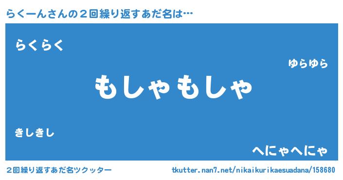 | 男性向けラノベタイトル風あだ名 | 『Re:らくーんから始める異世界生活』 |
