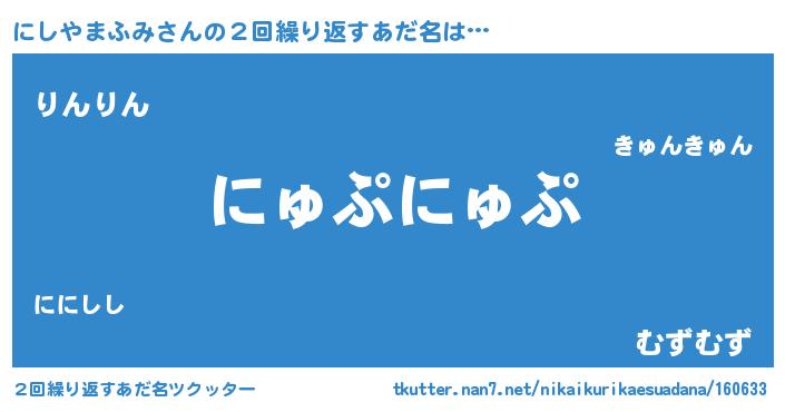 | 女子向けラノベタイトル風あだ名 | 『にしやまふみの卵を拾いまして』 |