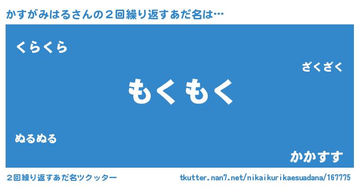 | 男性向けラノベタイトル風あだ名 | 『Re:かすがみはるから始める異世界生活』 |