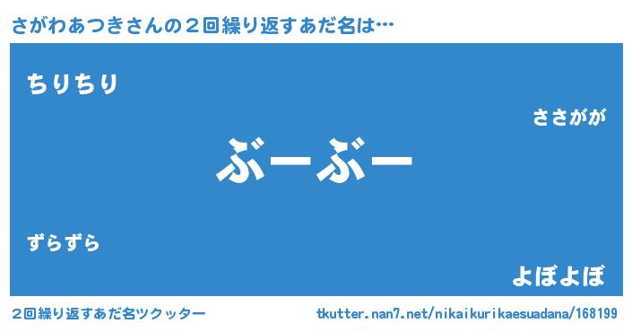 | 男性向けラノベタイトル風あだ名 | 『おまえをオタクにしてやるから、俺をさがわあつきにしてくれ! 』 |