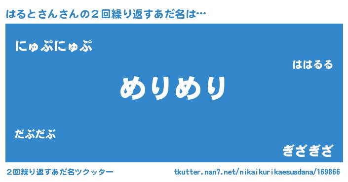 | 男性向けラノベタイトル風あだ名 | 『Re:はるとさんから始める異世界生活』 |