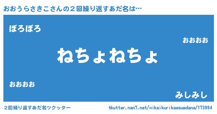 | 欧米人風あだ名 | 『ウサインおおうらさきこ』 |