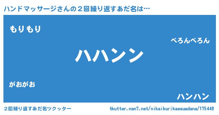 | 欧米人風あだ名 | 『アンジェラ・ハンドマッサージ』 |