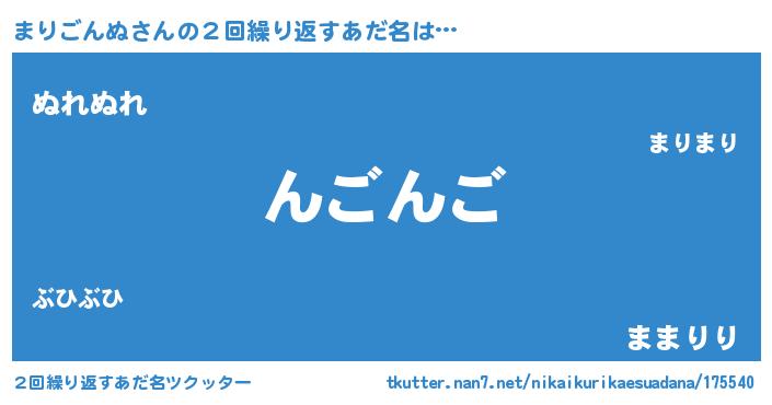 | 男性向けラノベタイトル風あだ名 | 『まりごんぬ~年齢イコール彼女いない歴の魔法使い~』 |