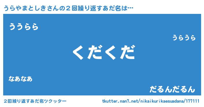 | 男性向けラノベタイトル風あだ名 | 『うらやまとしきという概念が存在しない退屈な世界 』 |