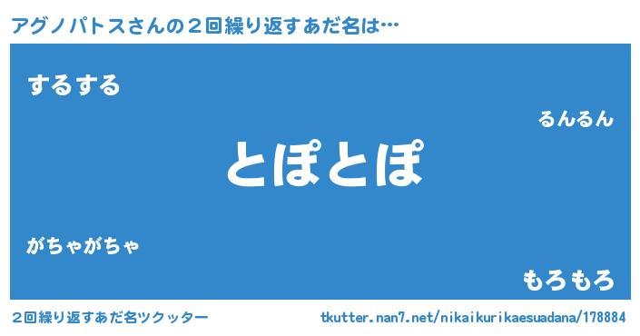 | 意味不明あだ名 | 『住所不定無職アグノパトス(5歳)』 |