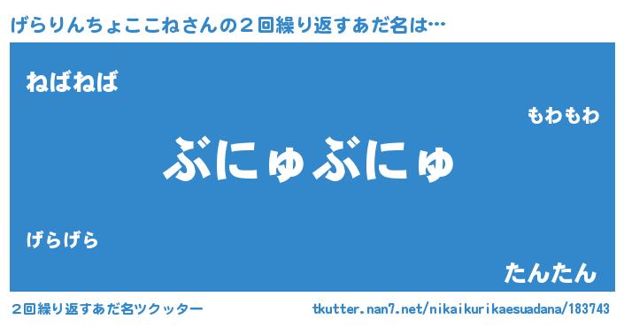 | 男性向けラノベタイトル風あだ名 | 『おまえをオタクにしてやるから、俺をげらりんちょここねにしてくれ! 』 |