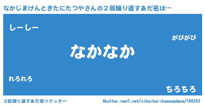 | 男性向けラノベタイトル風あだ名 | 『ナカジマケントキタニタツヤアートオンライン』 |
