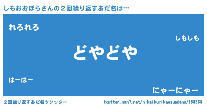 | 男性向けラノベタイトル風あだ名 | 『うちのしもおおぼらが世界を掌握している!』 |