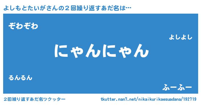 | 男性向けラノベタイトル風あだ名 | 『よしもとたいがの嫁は女の子じゃないと思った?』 |