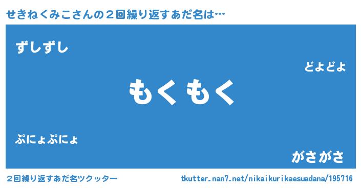 | 男性向けラノベタイトル風あだ名 | 『Re:せきねくみこから始める異世界生活』 |