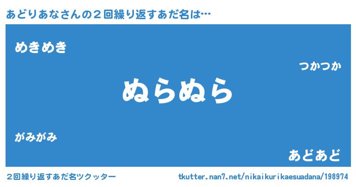 | 男性向けラノベタイトル風あだ名 | 『あどりあなの嫁は女の子じゃないと思った?』 |