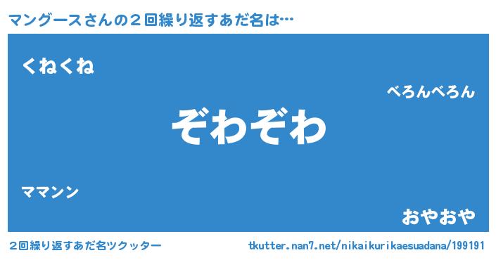 | 意味不明あだ名 | 『住所不定無職マングース(93歳)』 |