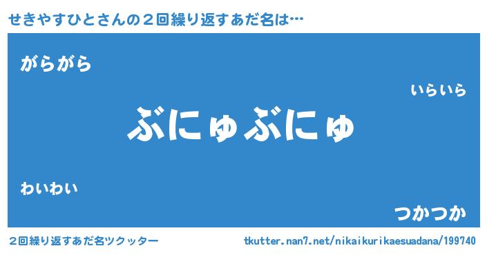 | 可愛いあだ名 | 『せきちゅっちゅ』『せきやすひとママ』 |