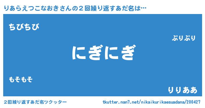 | 欧米人風あだ名 | 『ウサインりあらえつこなおき』 |