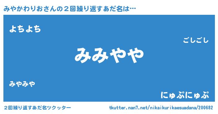 | 男性向けラノベタイトル風あだ名 | 『みやかわりおに滅ぼされるだけの簡単なお仕事です』 |