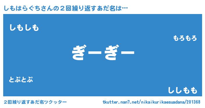 | 男性向けラノベタイトル風あだ名 | 『しもはらぐちという概念が存在しない退屈な世界 』 |