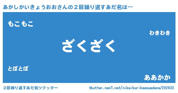 | 欧米人風あだ名 | 『アンジェラ・あかしかいきょうおお』 |