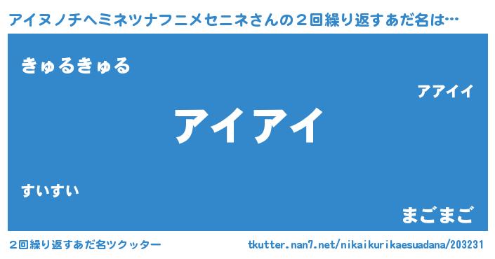 | 欧米人風あだ名 | 『マイケルアイヌノチヘミネツナフニメセニネ』 |