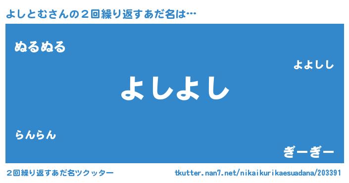 | 意味不明あだ名 | 『ペロリンよしとむ』『永久保存よしとむ』 |