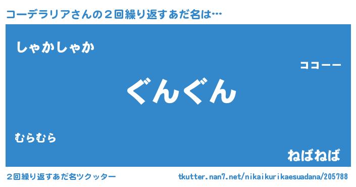 | ヘコむあだ名 | 『コーデラリア(小並感)』『コーっ子』 |