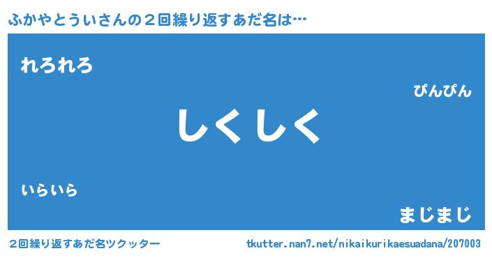 | ヘコむあだ名 | 『ふかぷりん』『ふかやとうい(笑)』 |